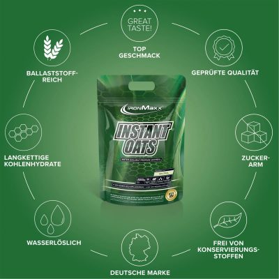 Bei den IronMaxx® Instant Oats handelt es sich um gemahlene Hafervollkornflocken, die sich ideal als Kohlenhydratquelle für Sportler und gesundheitsbewusste Menschen eignen. Mit bis zu 68g komplexen Kohlenhydraten und bis zu 396 kcal pro 100g ist dieses Produkt eine langanhaltende Energiequelle. Doch nicht nur als Energiequelle ist dieses Produkt unschlagbar. Es ist auch reich an Ballaststoffen und kann auf vielseitige Weise verwendet werden. Ob als leckeres Oatmeal zum Frühstück, als Zusatz im Proteinshake vor oder nach dem Training oder als Zwischenmahlzeit in Kombination mit Nüssen und Obst – die Einsatzmöglichkeiten sind nahezu unbegrenzt.