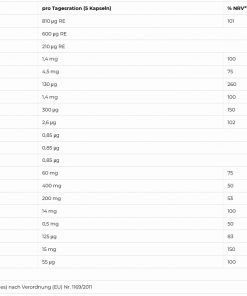 Calciumcitrat, Magnesiumcitrat, Kapselhülle (Überzugsmittel (Hydroxypropylmethylcellulose)), Vitamin C (Calciumascorbatdihydrat), Trennmittel (Magnesiumsalze der Speisefettsäuren, Siliciumdioxid), Eisenbisglycinat, Zinkbisglycinat, Pantothensäure (Calcium-D-Pantothenat), Kupferbisglycinat, Selenmethionin, Vitamin A (Retinylacetat), Riboflavin (Natrium-Riboflavin-5′-Phosphat), Vitamin B6 (Pyridoxal-5′-Phosphat), Vitamin A (Beta-Carotin), Folsäure ((6S)-5-Methyltetrahydrofolsäure, Glucosaminsalz), Kaliumiodid, Biotin (D-Biotin), Natriumselenit, Vitamin B12 (Methylcobalamin, Adenosylcobalamin, Hydroxocobalamin).
