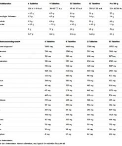 55% Eiweiß-Hydrolysat-Mischung (Molkeneiweißhydrolysat (aus Milch), Hühnereiweiß-Hydrolysat), Rinder-Protein-Hydrolysat, Füllstoff Calciumcarbonat; Festigungsmittel Calciumphosphate; Trennmittel Magnesiumsalze der Speisefettsäuren, Siliciumdioxid; Aromen.