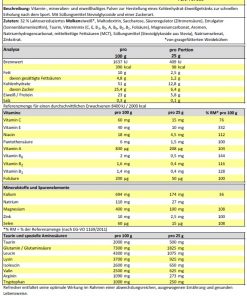 Nach dem Training 25g (2 gehäufte EL) in 250ml Wasser einrühren. Nach besonders harten Belastungen die doppelte Menge mit 500 ml Wasser mischen.