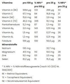 Das enthaltende Selen, Zink, Folsäure und Vitamine A, B6, C liefern einen Beitrag zu normalen Immunfunktion.