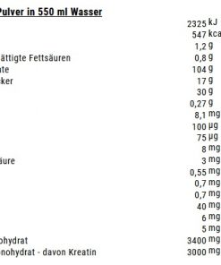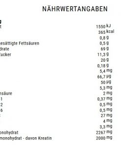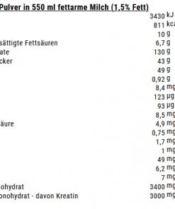 Der hohe Eiweißgehalt trägt zum Aufbau von Muskulatur bei, während die enthaltenen 3g Kreatin die körperliche Leistungsfähigkeit bei intensivem Krafttraining steigern.